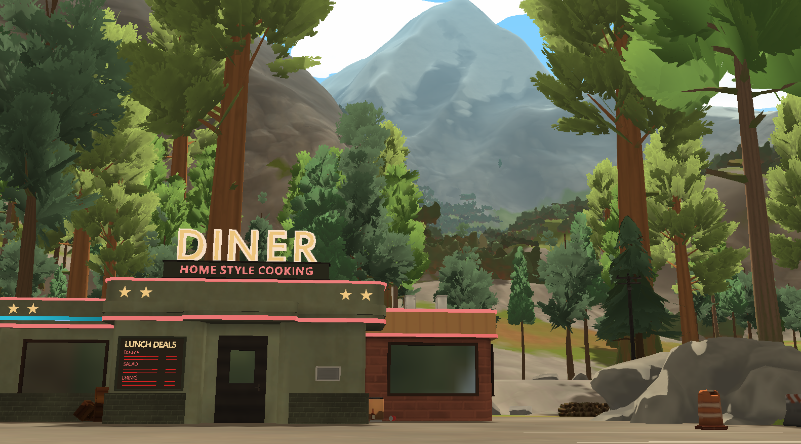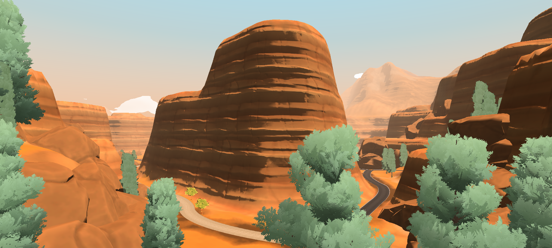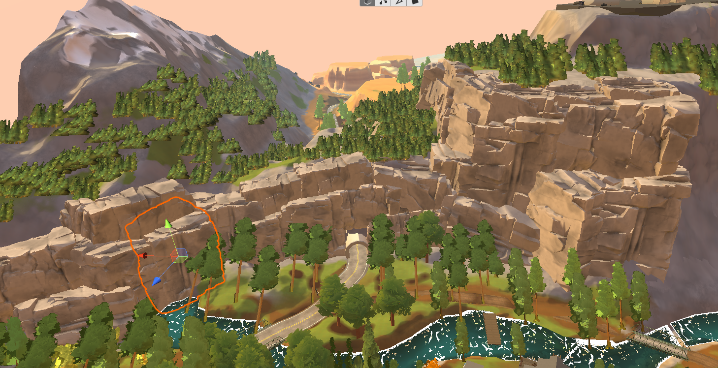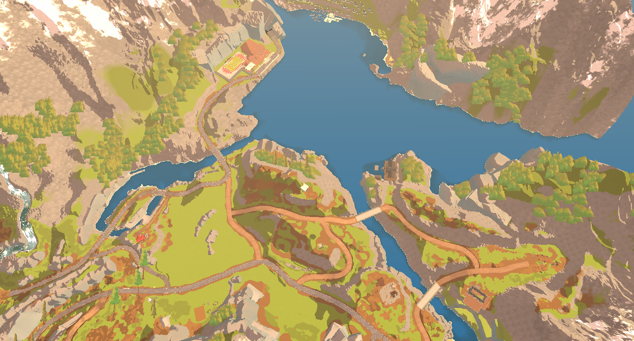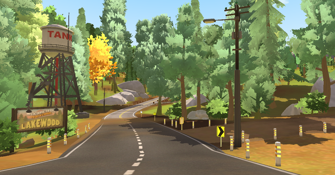 I worked on building the open world of Lakewood as an Art Director, Environment artist, Level designer and Level builder, within a team of two artists and one technical artist. To create this huge map with four different biomes (forests with high and low foliage variations, harvested fields, desert, red canyons) we took direct inspiration from the state of Oregon, Arizona and Utah. As we wanted to create a cozy atmosphere for this coop game, we went for a vibrant, painterly and warm art direction, with a soft and stylized shape language which also fit with our performances constraints. The landscape was created with the Unity landscape tool and custom made brushes by our technical artist. We used Substance Designer and Photoshop to make our terrain textures, Speed Tree for our foliage, shaders in Shadergraph, rocks with Maya and Substance Painter. Roads were a custom tool developped by our team.