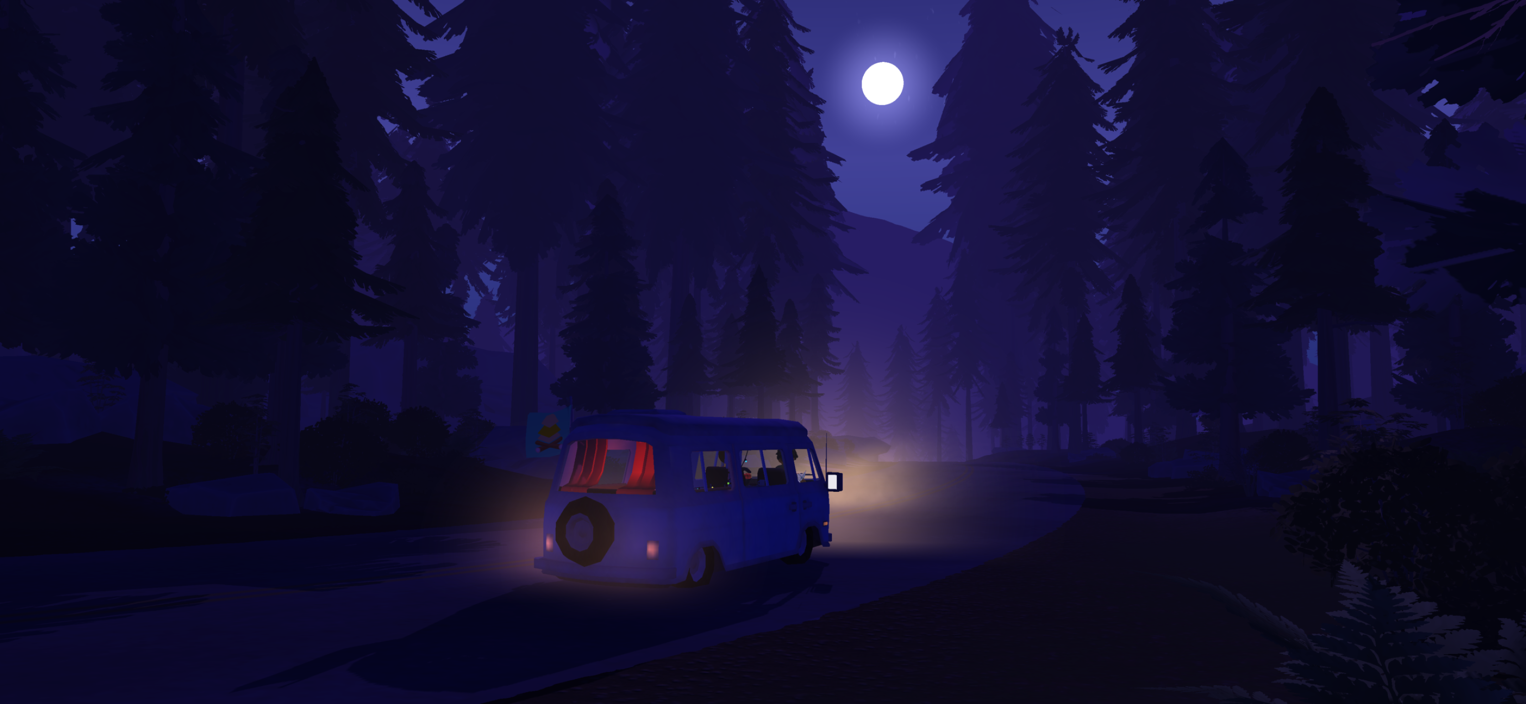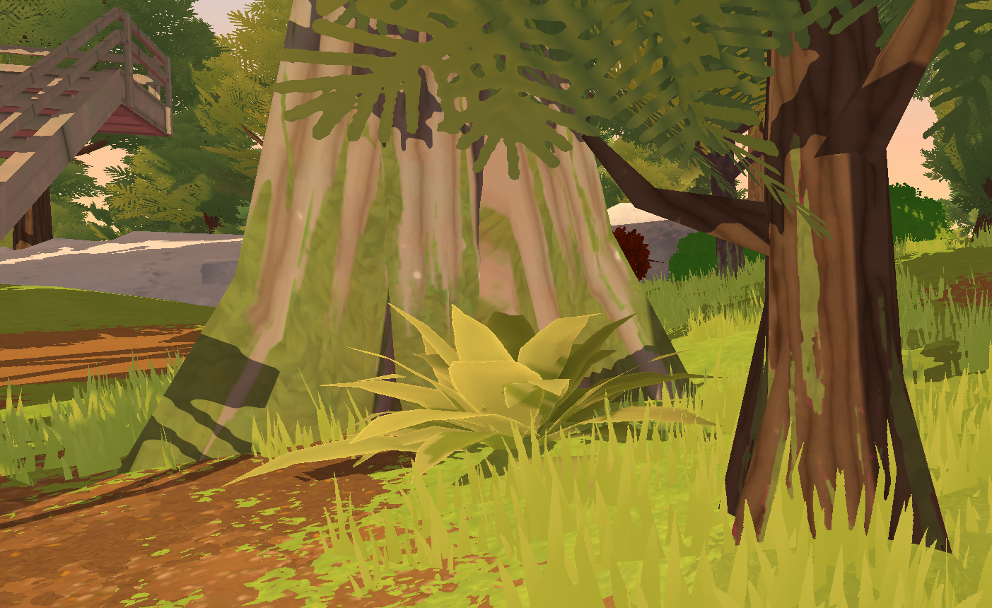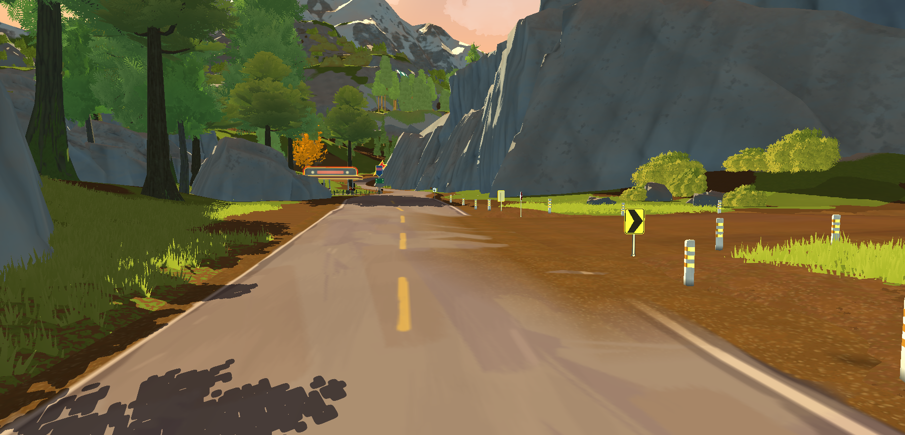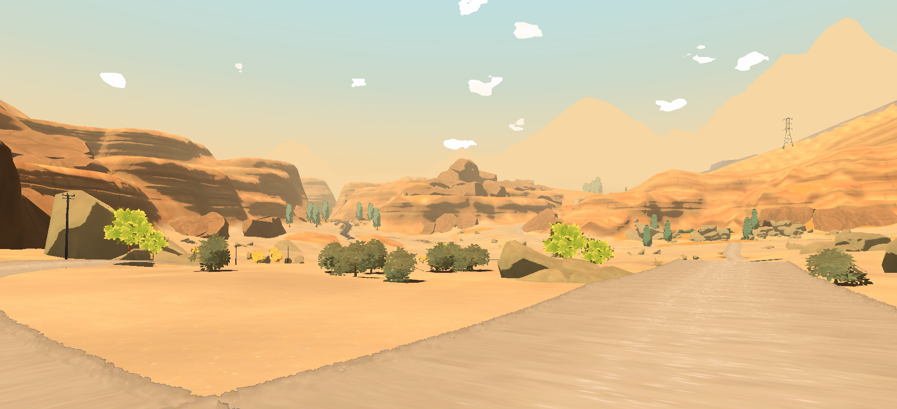 I worked on building the open world of Lakewood as an Art Director, Environment artist, Level designer and Level builder, within a team of two artists and one technical artist. To create this huge map with four different biomes (forests with high and low foliage variations, harvested fields, desert, red canyons) we took direct inspiration from the state of Oregon, Arizona and Utah. As we wanted to create a cozy atmosphere for this coop game, we went for a vibrant, painterly and warm art direction, with a soft and stylized shape language which also fit with our performances constraints. The landscape was created with the Unity landscape tool and custom made brushes by our technical artist. We used Substance Designer and Photoshop to make our terrain textures, Speed Tree for our foliage, shaders in Shadergraph, rocks with Maya and Substance Painter. Roads were a custom tool developped by our team.